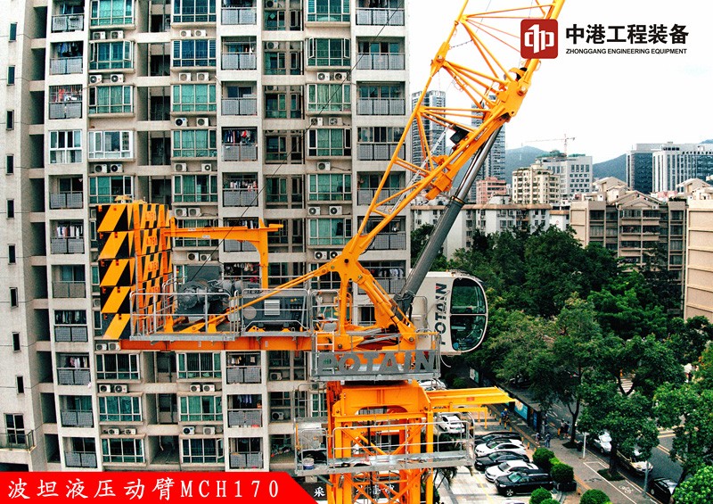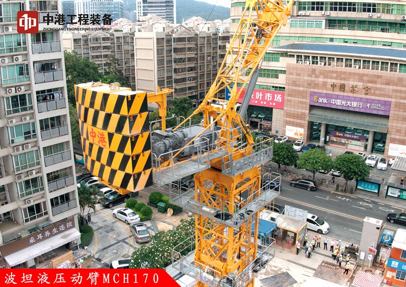 MCH170這款液壓動臂塔機,特別適合工地狹窄擁擠,空中回轉受限,對安全高效有著高要求的城市建筑施工。同時液壓油缸變幅動臂相較于通過卷揚機鋼絲繩變幅的動臂塔機技術優(yōu)勢更明顯。